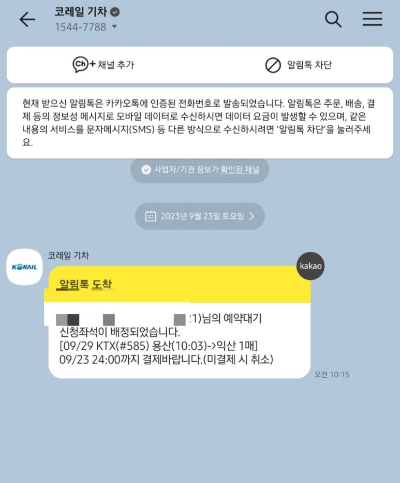 두번째는 코레일 어플에 알림설정을 해놓치 않은 경우