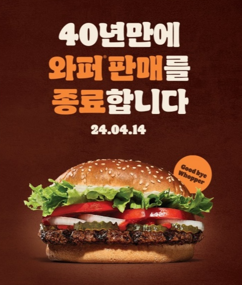 '굿바이 공지'라는 제목으로 40년 만에 와퍼 판매를 종료한다는 내용이었고 종료일은 14일이라고 적혀있었습니다.