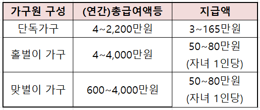 자녀양육을 지원하기 위해 부부 합산 총소득 4,000만 원 미만이면서 부양자녀(18세 미만)가 있는 경우 1명당 최대 80만 원을 지급하는 제도