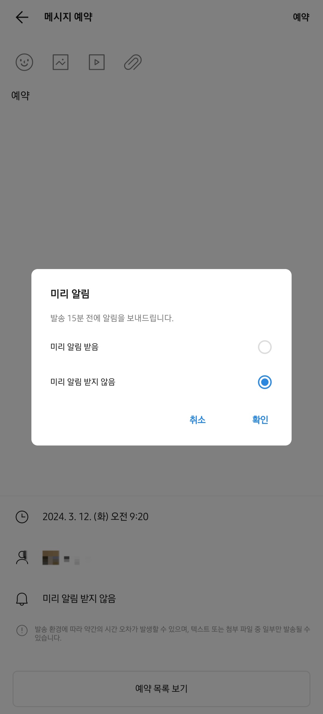 예약 메시지 발송 전 알림을 받을 것인지에 대해 설정 후 확인