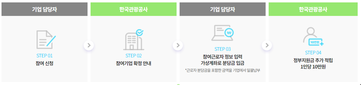참여신청-참여기업 확정 안내-참여근로자 정보 입력 가상계좌로 분담금 입금-정부 지원금 추가 적립 1인당 10만 원